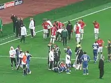 На 88-й минуте основного времени матча на поле вместо Скоулза вышел Гиггз, который побил тем самым принадлежащий Бобби Чарльтону рекорд по количеству матчей, проведенных за «Манчестер». Это был 759-й матч Райана в составе манкунианцев[64]. За 90 минут соперники не смогли выявить победителя, и арбитр из Словакии Любош Михел назначил дополнительное время.