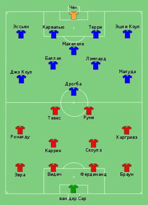 Главный тренер «Челси» Аврам Грант выпустил на поле одного форварда — ивуарийца Дидье Дрогба[60][61][62]. По флангам атаковать ворота соперника также должны были Джо Коул и Флоран Малуда, а из центральной зоны полузащиты — Фрэнк Лэмпард и Михаэль Баллак. Эшли Коул также вышел в стартовом составе, несмотря на то, что получил травму на тренировке после столкновения со своим одноклубником Клодом Макелеле[63].