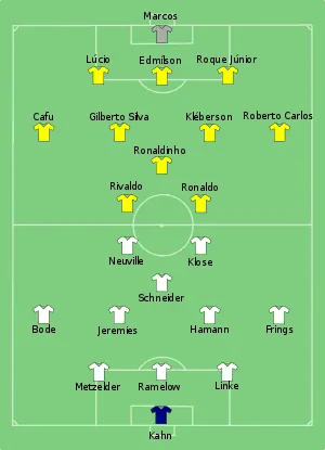Германия в целом владела территориальным преимуществом (по итогам матча соотношение владения мячом — 56/44 в пользу Германии), нанесла больше ударов по воротам (12). Бразильцы были более эффективны — всего 9 ударов по воротам, но при этом 7 в створ. Германия подала 13 угловых, но трио рослых центральных защитников бразильцев Лусио (188 см), Эдмилсон (186 см) и Роке Жуниор (188 см) не позволили европейцам реализовать ни один угловой, даже несмотря на присутствие в составе немцев таких мастеров игры головой как Марко Боде и Мирослав Клозе. Номинальные фланговые защитники бразильцев Кафу и Роберто Карлос в этом матчем полностью закрывали свои фланги, являясь полузащитниками. За опорную и центральную зону у бразильцев отвечали Жилберту Силва и дебютант сборной Клеберсон. Группу атаки составляли 22-летний Роналдиньо, Ривалдо и Роналдо. При этом Роналдо играл выдвинутого форварда, а Роналдиньо и Ривалдо действовали несколько ближе к своим воротам.