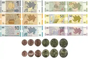 На сегодняшний день в Азербайджане существуют в обороте банкноты достоинством в 1, 5, 10, 20, 50 и 100 манатов. 1 манат равен 100 копейкам. В обращении находятся металлические монеты достоинством в 1, 3, 5, 10, 20 и 50 копеек. Эскизы банкнот маната разработаны австрийским дизайнером Роберт Калином из «OeBS» (Oesterreichische Banknoten und Sicherheitsdruck GmbH), который также является разработчиком дизайна евро-купюр.