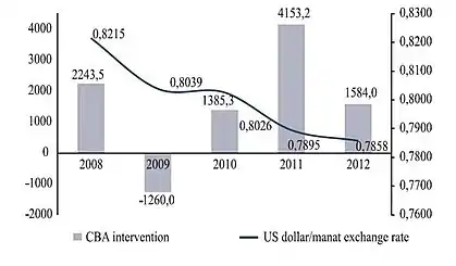 В 2012 году Центральный Банк АР осуществил курсовую политику учредив коридор двухвалютного обменного курса USD / AZN. На фоне переизбытка в платёжном балансе на денежном рынке предложение превзошёл спрос. Центральный Банк Азербайджана стал проводить интервенции.