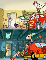 - Например, в эпизоде «Да здравствует Фуфелания» сюжетная линия Фуфелшмертца следовала шаблону сюжетной линии Финеса и Ферба, и наоборот