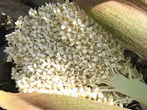Цветки мелкие, жёлтой окраски, собраны в метельчатые соцветия. Растения двудомные. Чашечка кубковидная, лепестков 3, в мужских цветах 6 тычинок, в женских 6 стаминодий и 3 свободные пестика, из которых большей частью только один даёт ягодный плод с одним семенем; на внутренней стороне семени глубокая борозда, в середине которой находится зародыш; белок роговой.