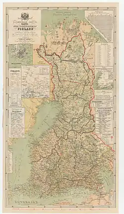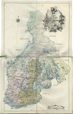 ![]() Шведская карта Финляндии 1775 года с разделением на лены | ![]() «Suomenmaan kartta» 1881 года. Участок карты, выделенный белым цветом — проект выхода Финляндии к Северному Ледовитому океану |