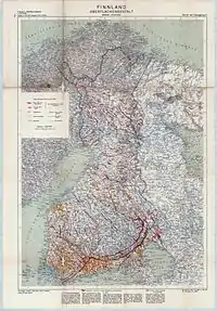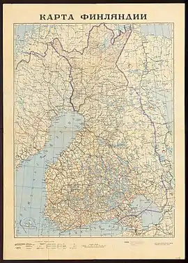 ![]() Карта Финляндии конца 1939 года, составленная Аэрографическим отделом ВВС РККА. Сиреневым цветом нанесена граница между СССР и Финляндской Демократической Республикой (марионеточным государством, созданным 1 декабря 1939 года на оккупированной Советским Союзом во время советско-финской войны 1939—1940 годов территории Карельского перешейка), согласно Договору о взаимопомощи и дружбе от 2 декабря 1939 года | ![]() Немецкая карта Финляндии 1941 года. Сплошной зелёной линией обозначена граница Финляндии и СССР по состоянию на март 1941 года, прерывистой линией — старая граница (до «зимней» войны 1939—1940 годов). Красным цветом отмечены месторождения песка, гравия и щебня; жёлтым — глины. На карте нет базы Северного флота — город Полярное (бывш. Александровск) |