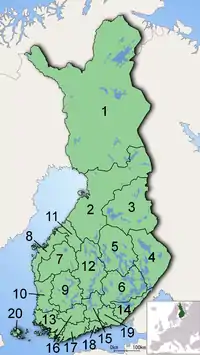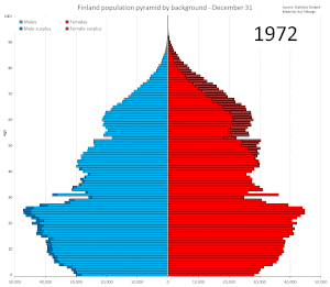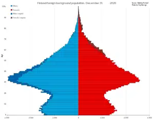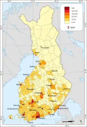 Финляндия — по состоянию на 1 июля 2021 года относительно малонаселенная страна с населением в 5 543 659 человек[4], сосредоточенными в основном в южных и центральных частях страны. Конституция Финляндии определяет финский и шведский языки как национальные языки. В конце 2020 года говорящие на финском языке составляли 86,9 % населения (4 811 067 чел.), говорящие на шведском языке — 5,2 % населения (287 871 чел.), а говорящие на саамском языке — 0,04 % населения (2 008 чел.).[8] Говорящие на других языках составляли 7,8 % (432 847 чел.) населения.[8]