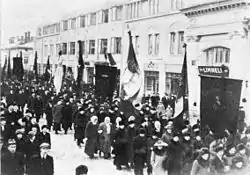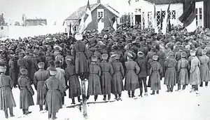 В декабре 1917 — январе 1918 годов обострилась борьба «красных», поддерживаемых Российской Советской Республикой, и шюцкором («охранными отрядами») — самодеятельной боевой организацией, впервые возникшей в революцию 1905 года («Союз силы»), запрещённой в 1909 году правительством России и возродившейся в 1917 году на прежних принципах, но под новым именем. Это противостояние переросло в революцию и гражданскую войну. В ходе революции «красными» было провозглашено Революционное правительство Финляндии[39], принявшее название Совет народных уполномоченных Финляндии, который поддержала Российская Советская Республика. Совет народных уполномоченных Финляндии контролировал южную территорию республики. Остальная территория была под контролем прежнего Финляндского сената. Эту сторону называют «белой» («белофиннами»). Костяк будущей её армии составили представители шюцкора. Белые были поддержаны кайзеровской Германией, которая направила в Финляндию свои войска (после окончания гражданской войны они были оставлены в Финляндии). Решающий перелом в Финляндской гражданской войне произошёл 3 апреля 1918 года, когда под Хельсинки высадился германский экспедиционный корпус под командованием генерала Рюдигера фон дер Гольца[40].