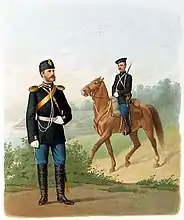 ![]() Обер-офицер в парадной форме и рядовой в обыкновенной форме военного времени. 1889 год[2] | |