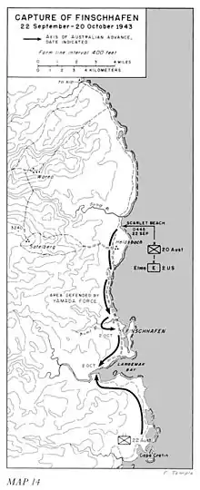 После высадки австралийцы создали плацдарм глубиной в несколько километров, во время которого были предприняты значительные действия вокруг Сики Коув и Катики[13][14]. В конце дня крупный японский воздушный налёт нанёс удар по флоту союзников у берега, но в конечном итоге он был отбит мощным американским истребительным прикрытием, который был предупреждён кораблями союзников[15]. На следующий день, 23 сентября, началось движение 20-й бригады по Финшхафену[16], когда два батальона начали наступление на юг - 2/13 и 2/15 при поддержке 2/12 полевого полка, а также инженеров из 2/3-я полевой роты - в то время как 2/17-я дивизия была разделена. Причём батальоны продвигались как часть резерва бригады, в то время как другая осталась, чтобы обезопасить плацдарм от нападения японцев и подтолкнуть его дальше на север[10] и четвертый толкнул в сторону Саттельберга[17]. 2/3-й инженерный батальон оставался на плацдарме, работая над улучшением дорог, в то время как 2/8-я полевая медицинская помощь создала основную перевязочную станцию, после того, как была эвакуирована с передовой перевязочной станции, которая следовала за наступлением батальонов на юг[18].