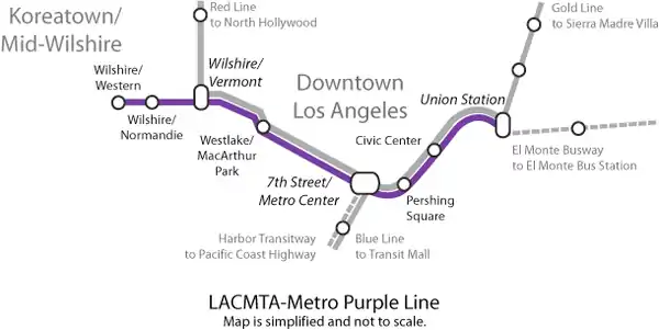 Изначально Фиолетовая Линия проектировалась как ответвление Красной Линии. Фиолетовая Линия была открыта в 1996 году, и её планировалось продлить в Вестсайд, но первый план продления провалился. Изначально она позиционировалась как вторая ветка Красной Линии, но в 2006 году она была переименована в Фиолетовую Линию, чтобы отличать её от другой части Красной Линии, идущей в Голливуд.