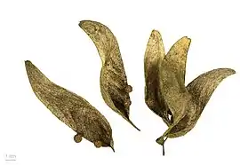 Плод — сборная пятичленная листовка длиной 3—10 см, растрескивается до созревания семян. Семена серовато-жёлтые, шаровидные, в диаметре около 1 см, съедобные, приятные на вкус, маслянистые.