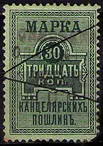 Пошлинными марками уплачивается государственная пошлина — установленный государством денежный сбор, взимаемый с юридических и физических лиц, в интересах которых специально уполномоченные органы совершают действия и выдают документы, имеющие юридическое значение. В СССР единые пошлинные марки, заменившие многочисленные виды фискальных марок (кроме консульских), стали использовать начиная с 1930 года. В Российской Федерации в период с 1 января 1992 по 1 января 1996 год пошлинные марки использовались в судах, нотариальных конторах, ЗАГСах. В судах марки наклеивались на заявления и кассационные жалобы, подаваемые в суд, при этом они погашались подписью судьи, принимающего эти документы, с указанием даты погашения, или печатью арбитражного суда[13]. С 1 января 1996 года пошлинные марки в России были выведены из оборота[14].