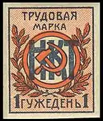 Трудовые марки составляют особую группу знаков обязательных сборов. В начале 1920-х годов в РСФСР была установлена трудовая повинность для нерабочих и некрестьян, о чём свидетельствовали трудовые марки, выпущенные Наркомтрудом для учёта рабочих дней (трудодней) и наклеивавшиеся в специальные учётные книжки. Существовала также гужевая (транспортная) повинность. Ей соответствовали трудовые марки с номиналом в гужеднях (гужднях). Марки обоих видов печатались в листах по 25 штук в каждом[21].