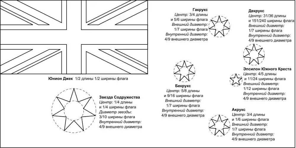 Внешний диаметр звезды Содружества составляет 3/10 части ширины флага, а остальных звёзд Южного Креста — 1/7 ширины флага, кроме Эпсилона, внешний диаметр которого — 1/12 часть ширины флага. Внутренний диаметр каждой звезды составляет 4/9 части внешнего диаметра[11].
