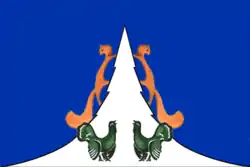 «Прямоугольное полотнище с отношением ширины к длине 2:3, синего цвета, в центре которого — вырастающая из нижнего края ель серебристого (белого) цвета, поддерживаемая двумя обернувшимися соболями золотистого (жёлтого) цвета; в центре нижней части ели — два сидящих навстречу друг другу токующих тетерева зелёного цвета».