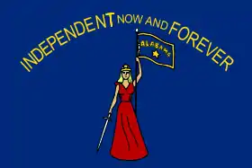 На лицевой стороне в середине синего полотнища изображена богиня свободы с опущенным мечом в правой руке и маленьким синим флагом с золотой звездой и надписью Alabama (с англ. — «Алабама») в левой. Над её фигурой аркой располагается надпись золотыми буквами: Independent now and forever (с англ. — «Независимая сейчас и навсегда»). На оборотной стороне изображён куст хлопка и справа от него извивающийся техасский гремучник. Ниже — золотая надпись: Noli me tangere (с лат. — «Не трогай меня»).