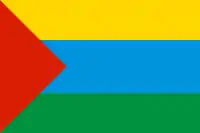 «Прямоугольное полотнище с отношением ширины к длине 2:3, состоящее из двух горизонтальных полос: синего (вверху) и белого (шириной 1/4 ширины полотнища) цветов; в центре синей полосы — стоящий к древку самец косули жёлтого цвета с рогами и копытами белого цвета; в центре белой полосы в ряд — три цветка Венерина башмачка жёлтого цвета с листьями зелёного цвета. Оборотная сторона полотнища зеркально воспроизводит лицевую сторону».