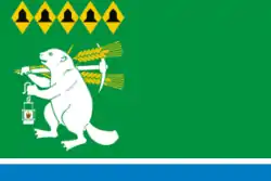 Полотнище с соотношением сторон 2:3, составленное тремя горизонтальными полосами: зелёной, белой и синей, занимающими 7/8, 1/32 и 3/32 от высоты полотнища соответственно. Зелёная полоса несёт на себе фигуры районного герба: бобр с лампой, киркой и колосьями, изображённые белым, жёлтым и красным цветами, и сопровождаемые сверху пятью жёлтыми сомкнутыми ромбами в пояс, обременёнными чёрной блёсткой беличьего меха каждый. Средина композиции из указанных фигур приходится на границу первой и второй от древка четвертей полотнища. Обратная сторона симметрична лицевой.