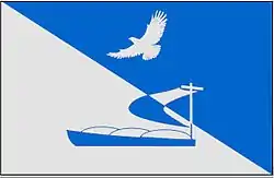 «В скошенном справа лазоревом и серебряном поле в серебре пониженная лазоревая баржа, нагруженная серебряными, окантованными лазурью мешками, имеющая на корме мачту с реей и поднятым парусом, которые положены поверх всего и в лазури переменяют цвет на серебро, сопровождаемая в лазури летящим в правую перевязь и видимым сверху серебряным орлом».