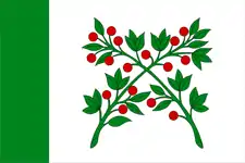 «Флаг представляет собой прямоугольное белое полотнище с отношением ширины к длине 2:3, несущее вдоль древка зелёную полосу в 1/5 длины флага, а посередине белой части полотнища фигуры герба: перекрещённые вишнёвые ветви с плодами, изображённые зелёным и красным цветами».