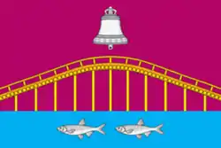 Геральдическое описание герба гласит: «В пурпурном поле на включённой лазоревой оконечности, обременённой двумя серебряными сорогами (плотвицами) — золотой выгнутый мост из брёвен со сквозными перилами, стоящий на одиннадцати шестах-опорах (одна подле другой) и сопровождаемый во главе серебряным колоколом».[4]
