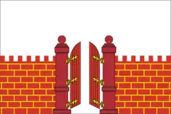 «Флаг городского поселения Верея представляет собой прямоугольное белое полотнище с отношением ширины к длине 2:3, на котором красными и жёлтыми цветами изображены зубчатая, доходящая до краёв полотнища стена с верейными столбами и полуоткрытыми воротами».