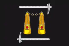 «Прямоугольное чёрное полотнище с отношением ширины к длине 2:3, воспроизводящее фигуры герба: две жёлтые, с красным пламенем, шахтёрские лампы, сопровождаемые двумя белыми кирками, сверху и снизу».