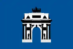 В центре полотнища — белая триумфальная арка с чёрными украшениями, габаритные размеры которой составляют 3/4 длины и 7/15 ширины полотнища флага».