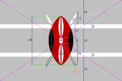 Флаг Кении состоит из трёх горизонтальных полос чёрного, красного и зелёного цветов, разделённых между собой двумя белыми горизонтальными полосами. В центральной части флага находится изображение красно-бело-чёрного щита африканского народа масаи, а за ним — изображение двух белых перекрещенных копий. Цвета имеют следующее значение:
