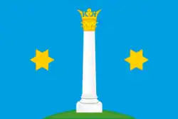 «Флаг округа представляет собой прямоугольное голубое полотнище с отношением ширины к длине 2:3 с изображением фигур герба: зелёного холма, на котором стоит белая колонна с жёлтой капителью, увенчанная жёлтой же древней царской короной и сопровождённая по сторонам двумя жёлтыми шестилучевыми звёздами, каждая двумя зубцами вверх».