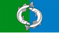 Верхняя часть полотнища рассечена на две части синего и зелёного цветов, обозначающие принадлежность к Ханты-Мансийскому автономному округу — Югре (эти же цвета — символ обилия озёр и лесов).