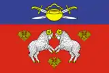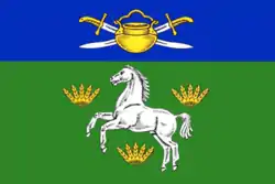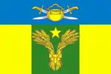 Флаг разработан на основе герба, описание которого гласит: «В лазоревом поле серебряный сокол с распростёртыми крыльями, золотым клювом и лапами, держащими золотой котёл поверх двух скрещённых серебряных сабель с золотыми рукоятями и сопровождаемых серебряными рыбками, направленными друг к другу, вверху веерообразно положенным пучком из пяти пшеничных колосьев».