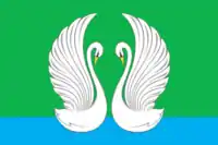 «Прямоугольное двухстороннее полотнище зелёного цвета с отношением ширины к длине 2:3, несущее вдоль нижнего края голубую полосу размером 1/2 ширины полотнища; посередине полотнища — сближенные фигуры двух плывущих навстречу друг другу с поднятыми крыльями белых (с чёрными и серыми контурами) желтоклювых лебедей. Фигуры лебедей равноудалены от верхнего и нижнего краёв полотнища на расстояние, равное 1/10 его ширины».