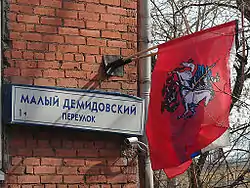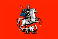 «Флаг города Москвы представляет собой прямоугольное полотнище красного (алого) цвета. В центре флага расположено цветное изображение основного элемента герба Москвы — Георгий Победоносец в серебряных доспехах и лазуревой приволоке (мантии), на серебряном коне, поражающий золотым копьём чёрного змия.
