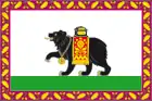 «Прямоугольное двухстороннее полотнище с отношением ширины к длине 2:3, состоящее из двух горизонтальных полос белого и зелёного цвета (в отношении 3:1) и окаймлённое полосой малинного цвета (шириной 1/10 ширины полотнища) покрытой жёлтой гирляндой из дубовых листьев, чередующихся с соединёнными попарно желудями на черенках. В центре полотнища идущий по зелени медведь чёрного цвета с золотыми глазами, языком и когтями, на шее которого на жёлтой цепи подвешен жёлтый медальон украшенный самоцветами, а на спине — стоящий на красном рушнике, расшитом жёлтым цветом, чёрный ларец с жёлтыми украшениями».