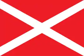 - Андреевский крест с белым кантом на красном фоне[9]; возможно, основан на дизайне флага движения «Наши», который использовался в одной из первых публикаций с упоминанием термина «Новороссия»[10].