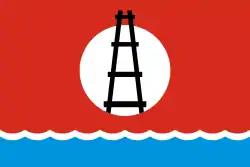 — белый круг на красном поле представляет собой своеобразное окно в будущее района, связанное с нефтегазовыми месторождениями. Круг — символ общности, единства;