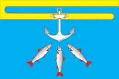 «Прямоугольное двухстороннее полотнище с отношением ширины к длине 2:3, состоящее из четырёх полос (жёлтого, голубого, жёлтого и голубого цвета) в отношении 1:1:1:9, при этом верхняя голубая полоса слева и нижняя жёлтая полоса справа не достигают края полотнища и скруглены. В середине полотнища вверху белый морской якорь, кольцом на голубой верхней части полотнища, а под ним три веерообразно обращённые к носу якоря белые сёмги, с красными жабрами, плавниками и хвостом, при этом левая сёмга — спиной влево, остальные — вправо».