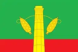 «Прямоугольное зелёное полотнище с соотношением ширины к длине 2:3, несущее вдоль нижнего края красную полосу шириной 1/4 ширины полотнища; в центре полотнища изображены две наклонённые к краям бобины соединённые друг с другом нитью перевитой за жёлтой колонной».