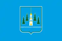 «Флаг представляет собой прямоугольное лазоревое полотнище с соотношением ширины к длине 2:3, несущее в центре двустороннее изображение основных элементов: трёхъярусная серебряная (белая) колокольня с золотыми (жёлтыми) кровлями и шпилем (в центре композиции), сопровождаемая по сторонам четырьмя зелёными елями, тонко окаймлёнными серебром (белым) — две и две, а внизу по всей длине полотнища — двумя узкими волнистыми серебряными (белыми) поясами, составляющими одну седьмую ширины флага».