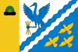 «Прямоугольное полотнище с соотношением ширины к длине 2:3, продольно разделённое на три равновеликих горизонтальных полосы: золотисто-жёлтую, лазоревую и белую. В центре средней лазоревой полосы помещено изображение золотисто-жёлтого ромба в пояс, имеющего высоту равную ширине полосы и соотношение собственных высоты к ширине 4:5».