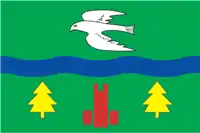 В нижней зелёной части помещено изображение красной, мурованной белыми швами, стелы между двух жёлтых елей. Габаритные размеры изображения составляют 43/60 длины и 7/20 ширины полотнища. Центр изображения равноудалён от боковых краёв полотнища и находится на расстоянии 9/40 от нижнего края полотнища».
