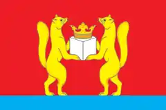 «Прямоугольное полотнище красного цвета с отношением ширины к длине 2:3, вдоль нижнего края которого — синяя полоса шириной 2/15 ширины полотнища, на которой восстают два жёлтых сообращённых соболя, поддерживающих перед собой белый куб, с лежащей на нём жёлтой короной».