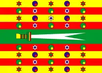 Считается, что он был введён Аль-Хусайном II ибн Махмудом, хотя некоторые источники, такие, как Абдель-Вахаб, утверждают, что он использовался на протяжении трёх предшествовавших Аль-Хусайну столетий[3]. Флаг имел прямоугольную форму и был разделён на девять горизонтальных полос: среднюю — зелёного цвета, вдвое более широкую, чем остальные полосы, и восемь чередующихся полос красного и жёлтого цветов[2]. В центре зелёной полосы изображался Зульфикар, легендарный исламский меч Али, с белым лезвием и многоцветным эфесом. На каждой из красных и жёлтых полос изображались по пять фигур, причём порядок варьировал от полосы к полосе. Эти фигуры можно подразделить на две категории: шестиконечные звёзды со вписанными по их центру кругами (звёзды красного цвета заключали в себе зелёный круг, а белого цвета — синий) и круги, заключающие в себе ещё один круг меньшего размера, чуть смещённый книзу и вправо (большой синий круг — круг красного цвета, а зелёный — жёлтого цвета)[2]. При этом на первой жёлтой полосе изображались три красные звезды и два синих круга, на второй (красной) полосе — три зелёных круга и две белые звезды. Третья полоса (жёлтая) была сходна с первой, но центральная звезда на ней изображалась белой, тогда как четвёртая полоса была идентична второй[2].