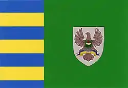 Флаг района представляет собой прямоугольное полотнище с соотношением сторон 2:3. По вертикали флаг разделён на две части. Часть от древка длиной 1/3 длины флага разделена по горизонтали на семь равновеликих полос жёлтого (из полосы) и синего (4 полосы) цветов. Вторая часть зелёного цвета занимает 2/3 длины флага. В её центре размещено изображение герба района.