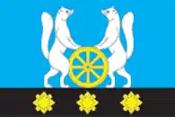 «Прямоугольное голубое полотнище с отношением ширины к длине 2:3, несущее вдоль нижнего края чёрную полосу в 1/4 полотнища; на основной, голубой части вплотную к полосе воспроизведено жёлтым и белым цветами изображение двух горностаев, поддерживающих колесо; на полосе воспроизведено жёлтым цветом изображение трёх стилизованных камней».