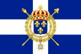 При королях из династии Бурбонов в качестве государственного использовался белый флаг, усеянный золотыми лилиями. В центре флага помещался синий щит с лилиями, окружённый цепями орденов Святого Духа и Святого Михаила и поддерживаемый двумя ангелами[11] (рис. 6 и 7).