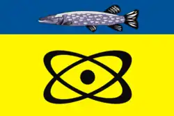 В центре жёлтой полосы помещено изображение знака атома чёрного круга, в окружении двух вытянутых чёрных колец. Габаритные размеры изображения составляют 1/2 длины и 7/16 ширины полотнища».