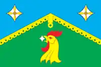 «Прямоугольное двухстороннее полотнище с отношением ширины к длине 2:3, разделённое по горизонтали фигурным стропилом жёлтого цвета, выходящим из середины вертикальных краёв, на голубую (меньшую) и зелёную части. В голубой части полотнища — два белых вогнутых ромба с жёлтым вписанным четырёхлопастным пропеллером в каждом. В зелёной части полотнища — жёлтая голова петуха с красными гребнем, глазами и бородкой, держащая в клюве белый вогнутый ромб».