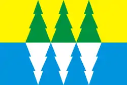«Прямоугольное двухстороннее полотнище с отношением ширины к длине 2:3, составленное из двух равных горизонтальных полос жёлтого и голубого цвета. В середине жёлтой полосы три вписанные по высоте и соприкасающиеся внизу зелёные острия в виде еловых крон, а на голубой полосе — таковые же острия, но опрокинутые и серебряные».